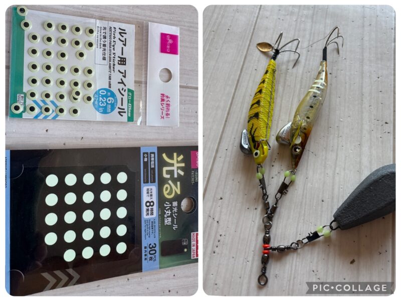 暗い海でも目立つようにと『ダイソー』で購入した蓄光シールと目玉シールを貼ったエギ。