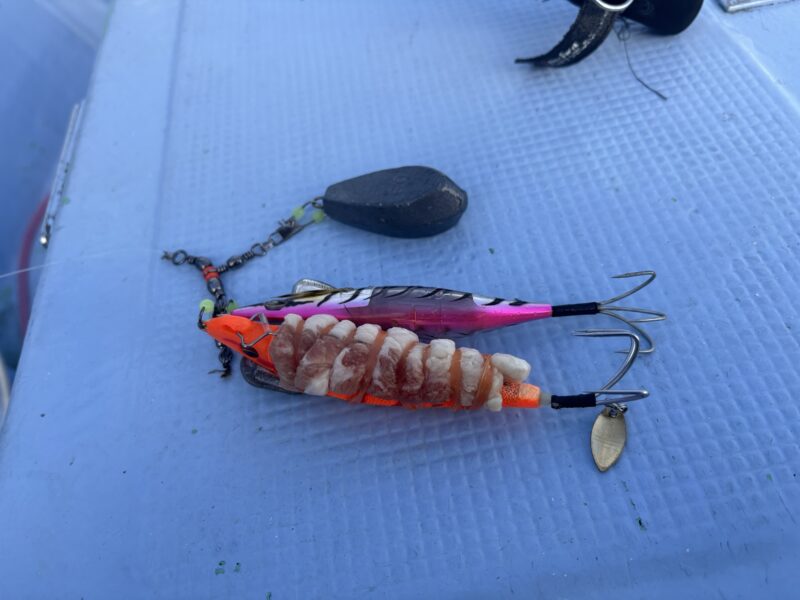 次は前もって用意しておいた肉乗せ餌木に変更。