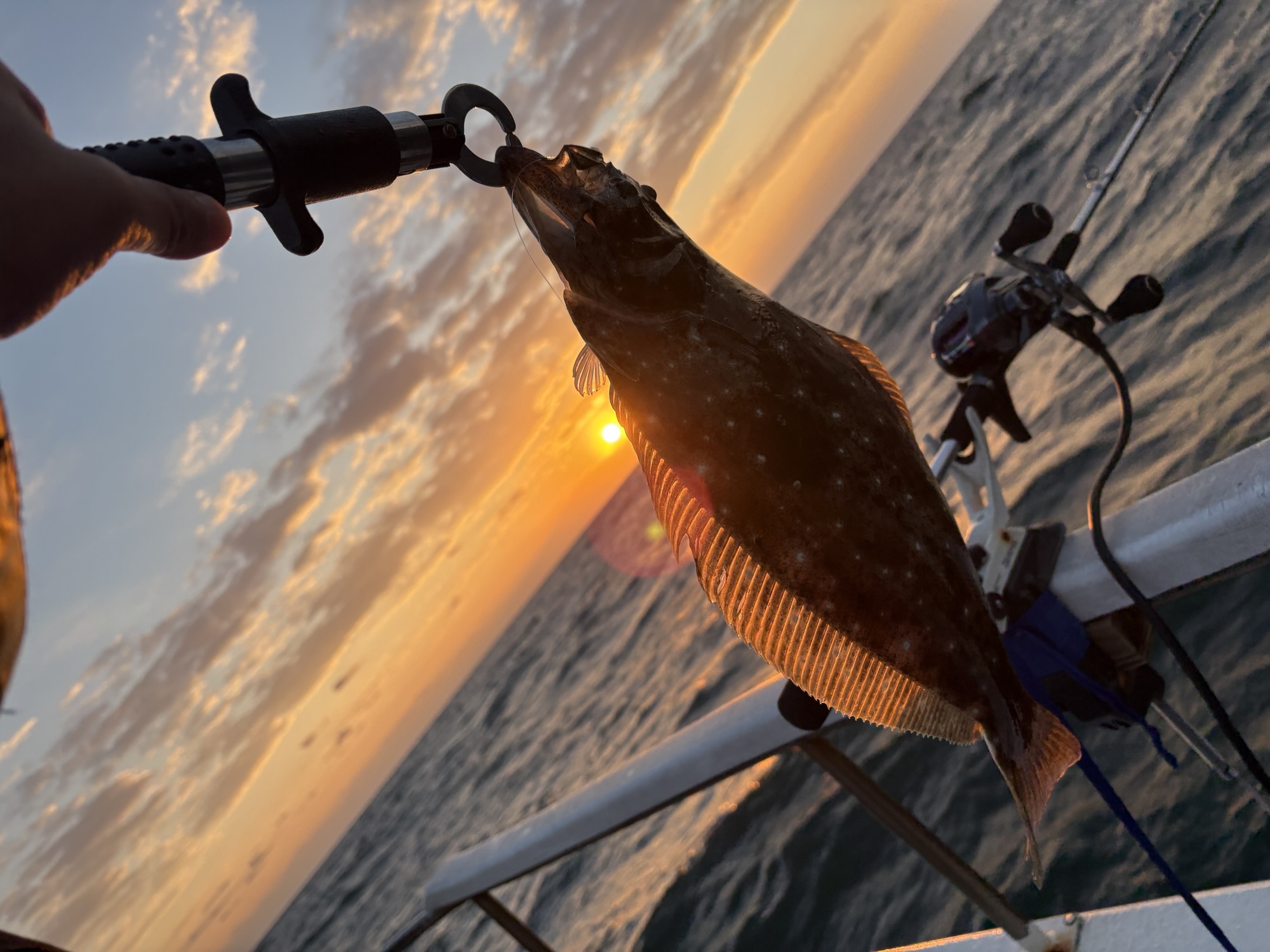 小型だが嬉しい今季の1号ヒラメをGET!!!!朝日をバックに記念撮影。