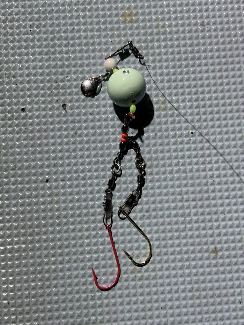 中通しオモリ40号+コロラドブレード+親子サルカン+4/0の針2本仕掛け。