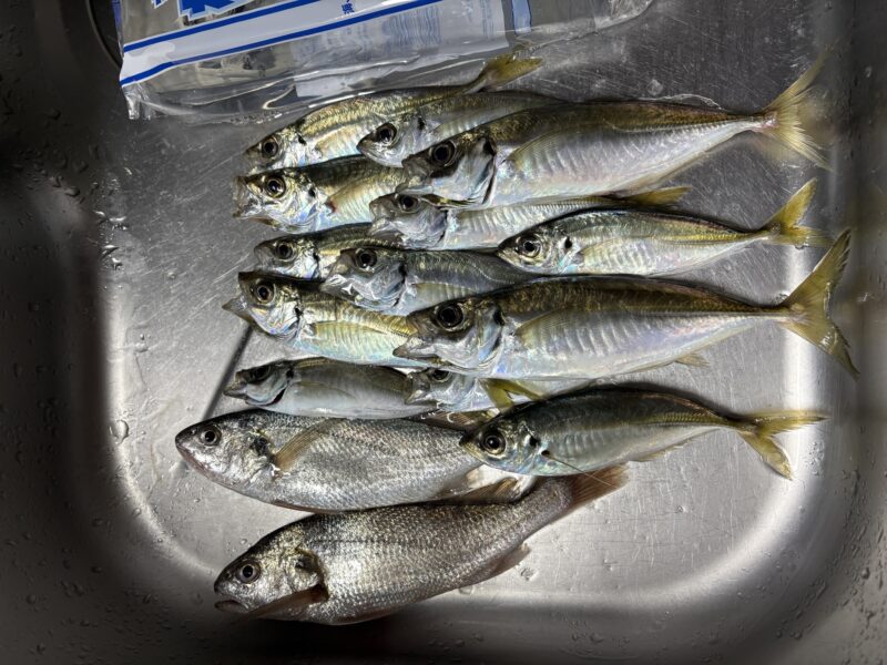 釣果:小あじ~中アジ14匹、イシモチ2匹、セイゴ1匹
