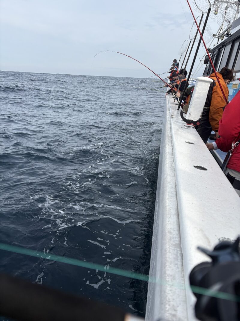 船上はミヨシまで竿がびっしり並んでいるが、誰も釣れない。