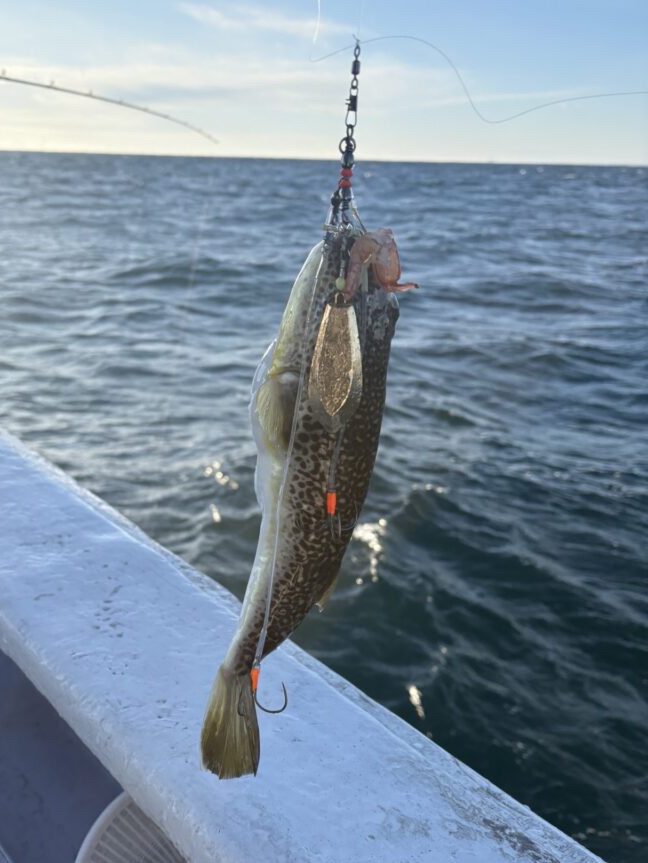 船中3匹目かな?フグの群れは小さくみんなが釣れるわけではない。